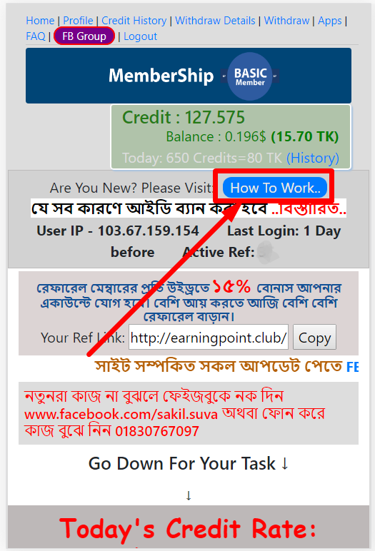 এই সাইটে মুলত ক্রেডিট দিয়ে টাকার হিসাব করা হয়। মানে আপনাকে ক্রেডিট আয় করতে হবে যত ক্রেডিট আয় করবেন তত টাকা পাবেন। সাধারণত ৬৭০ ক্রেডিটে ১ ডলার হয় আর ডলার রেট 1$ = ৮০ টাকা। প্রতি ২৪ ঘন্টায় ৩-৪ বার ৪ থেকে ১০ ক্রেডিট পর্যন্ত বোনাস দিয়ে থাকে। এবং টাস্ক ১, টাস্ক ২, টাস্ক ৩ এভাবে অনেক কাজ দেওয়া আছে সাথে কীভাবে কাজ করবেন সেটার কথাও উল্লেখ আছে। সুতরাং যদি আপনি ভালোভাবে কাজ করেন তাহলে দৈনিক ১০০- ২০০ ক্রেডিট পর্যন্ত আয় করতে পারবেন।