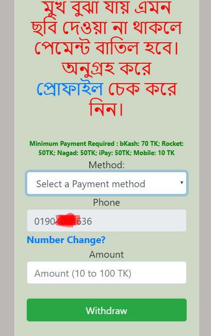টাকা উইথড্র দেওয়ার জন্য সবার উপরে Withdraw লেখায় ক্লিক করুন। নিচের মত দেখতে পারবেন। এখানে আপনি যে মেথডে টাকা নিতে চান সেটি সিলেক্ট করুন আর মোবাইল নাম্বার যেটা দিয়ে আপনি রেজিস্ট্রেশন করেছিলেন সেতা অটোমেটিক সেট করা থাকবে। এরপর আপনি যত টাকা উইথড্র দিবেন সেই আমাউন্ট দিয়ে Withdraw তে ক্লিক করুন। সর্বচ্চো ২৪ ঘন্টা লাগতে পারে পেমেন্ট পেতে। মনে রাখবেন উইথড্র দেওয়ার জন্য কমপক্ষে ১০ টাকা আপনার একাউন্টে থাকতে হবে ১০ টাকার কম উইথড্র দেওয়া যাবে না।